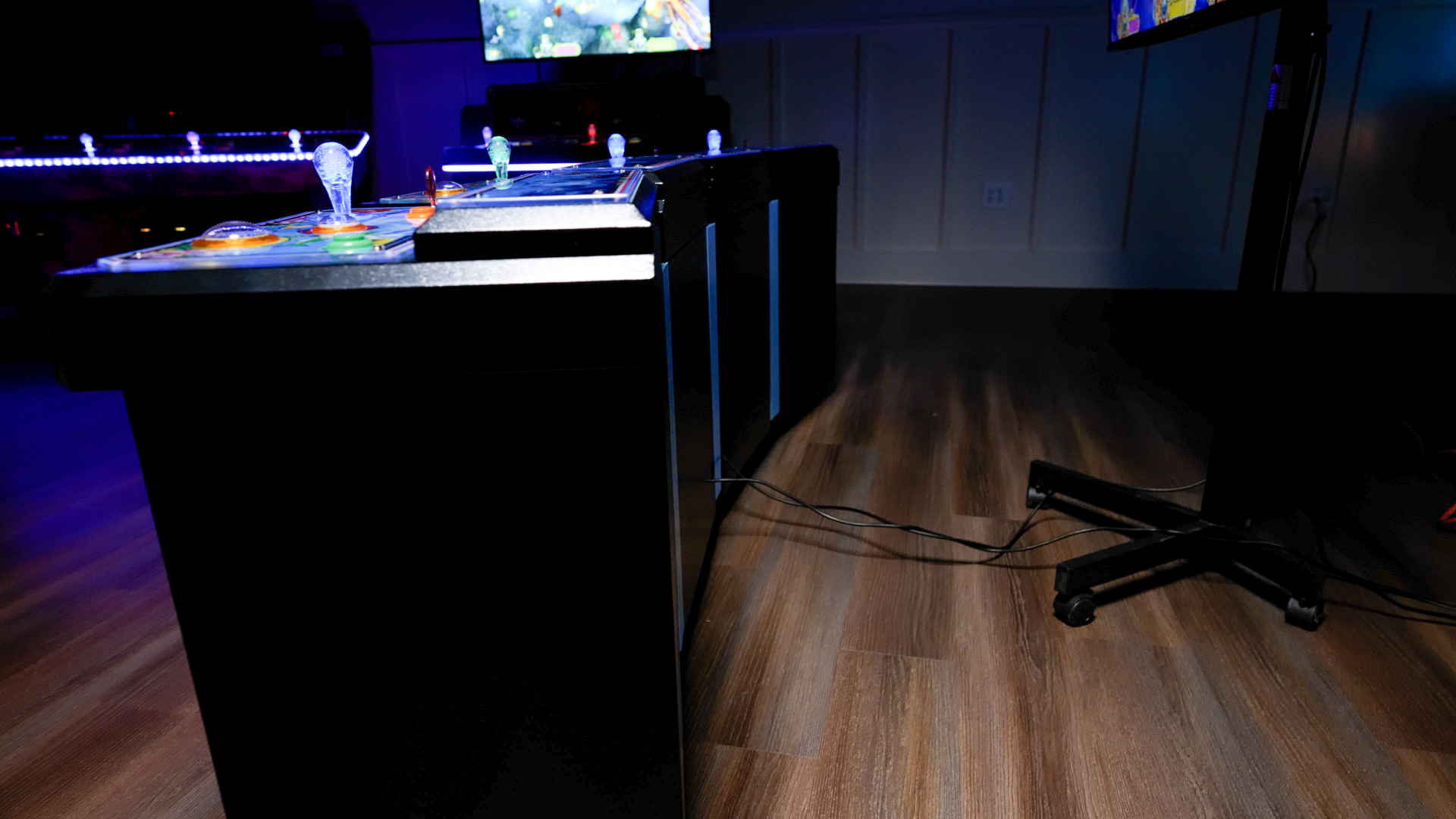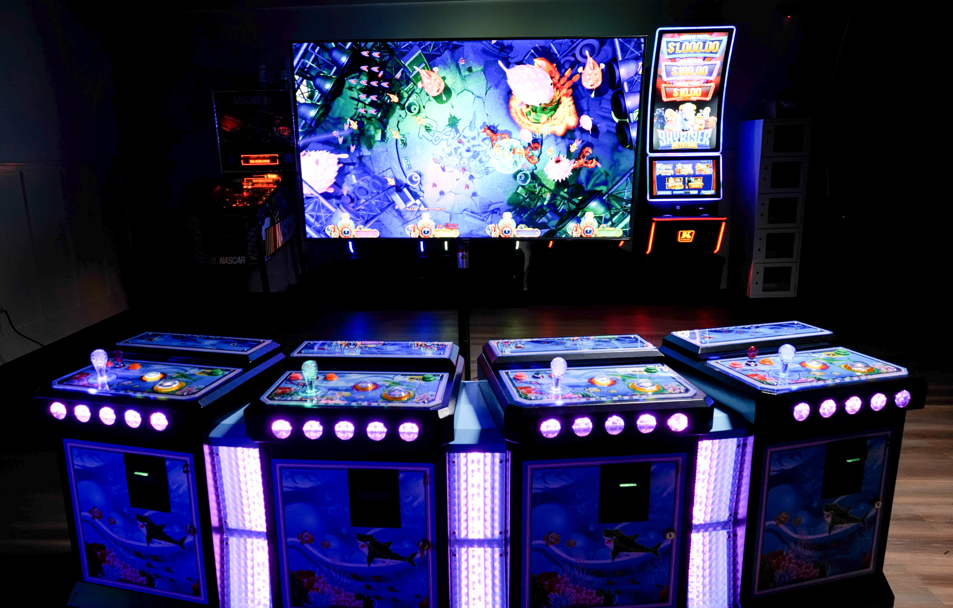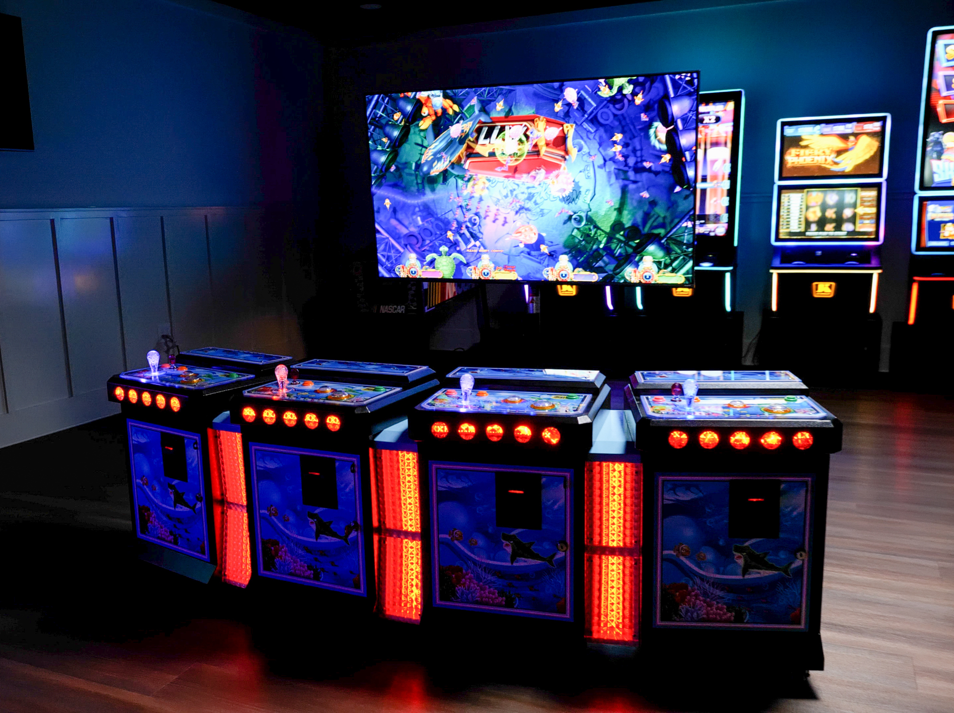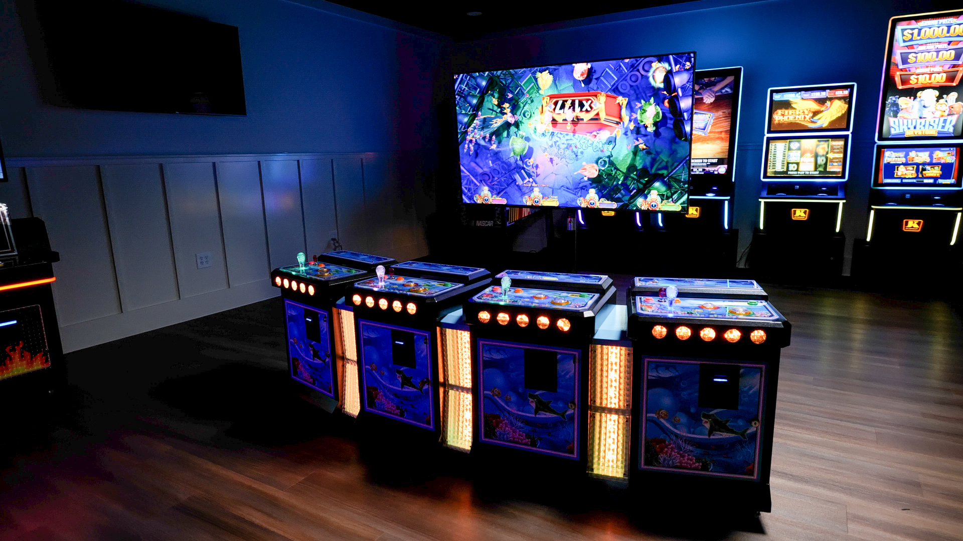 This 4 player metal Console is IGS board ready. The cabinet comes complete with a 12/5v power supply, amp/speaker, Fuse box, LED lights and all player harnesses. The harnesses are pre wired for 12v Bill acceptors and printers. The player station doors are pre Fabricated so you can easily mount the printers and Bill validators on the doors. You can either mount a 60” TV on the wall or you can use a projector screen as your video display. These cabinets also include the IGS 4 player payout print wires. The cabinets also have wheels and adjustable base stands on the bottom of the console.